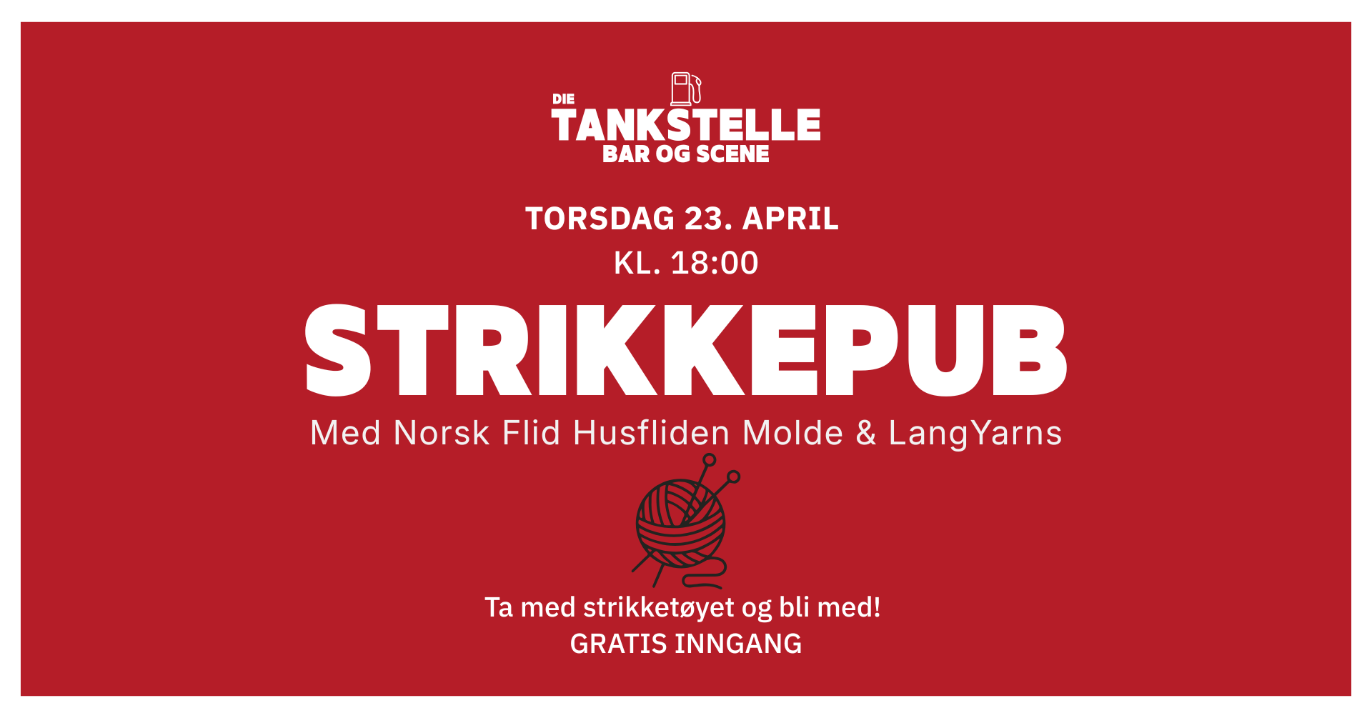 Torsdag 23. april inviterer vi til en hyggelig og sosial kveld på Die Tankstelle – en unik møteplass midt i Molde. Dette er arrangementet for deg som er glad i strikking, håndarbeid eller bare ønsker en avslappet kveld med god stemning.