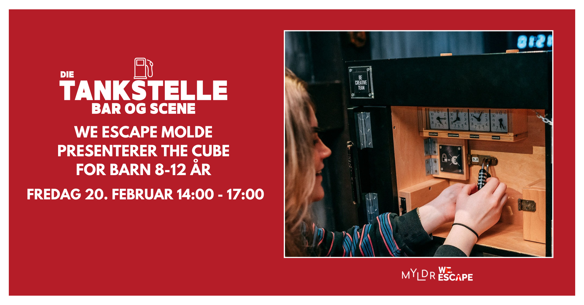 MYLDR og We Escape Molde inviterer til The Cube på Die Tankstelle. Løs morsomme oppgaver sammen med laget ditt på en pub midt i Molde sentrum! Fra 14:00 - 17:00. En runde tar cirka én time. Du kan melde på deg og laget frem til 16:00.